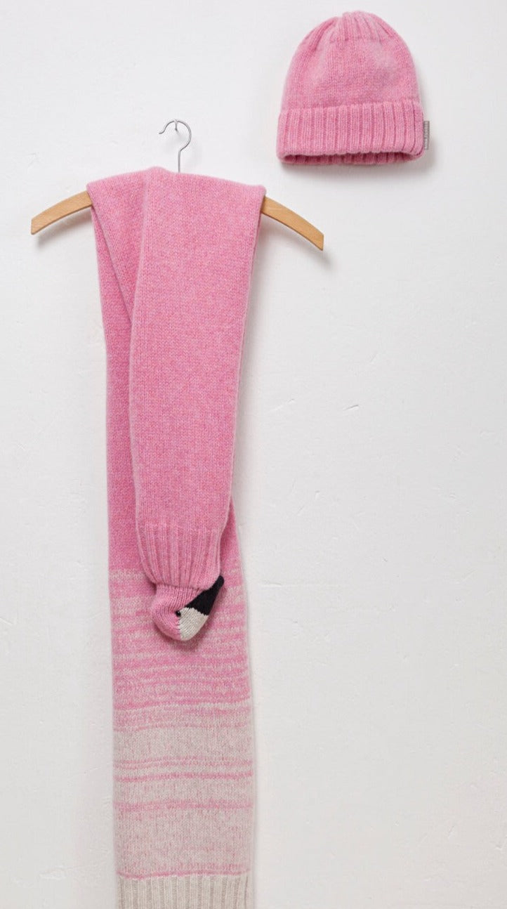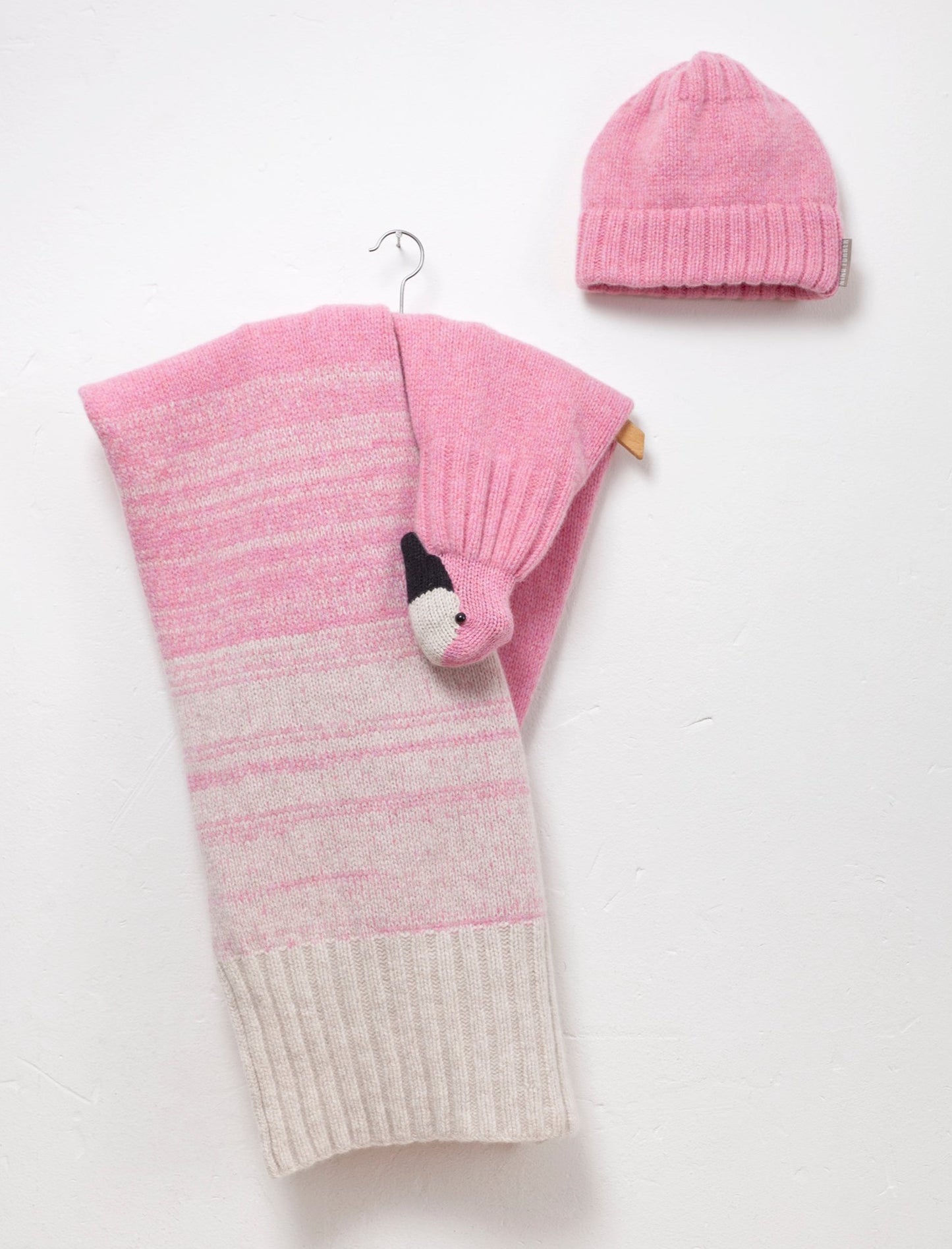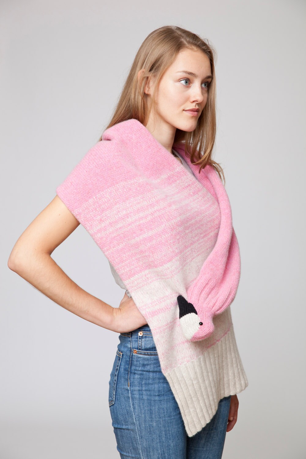 In de snavel van de flamingo zit een sterke klem die tevens als sluiting dient. In het uiteinde van de stola is een kleurverloop gebreid.