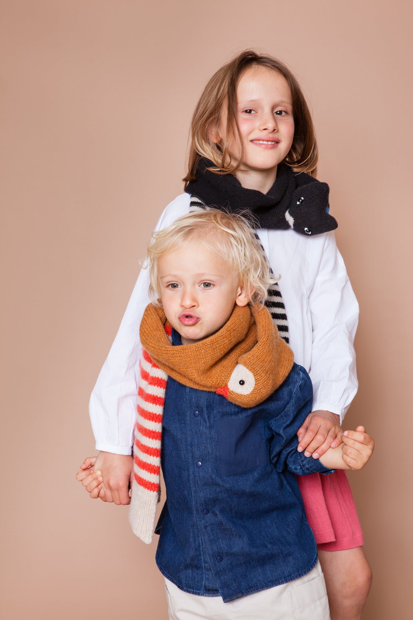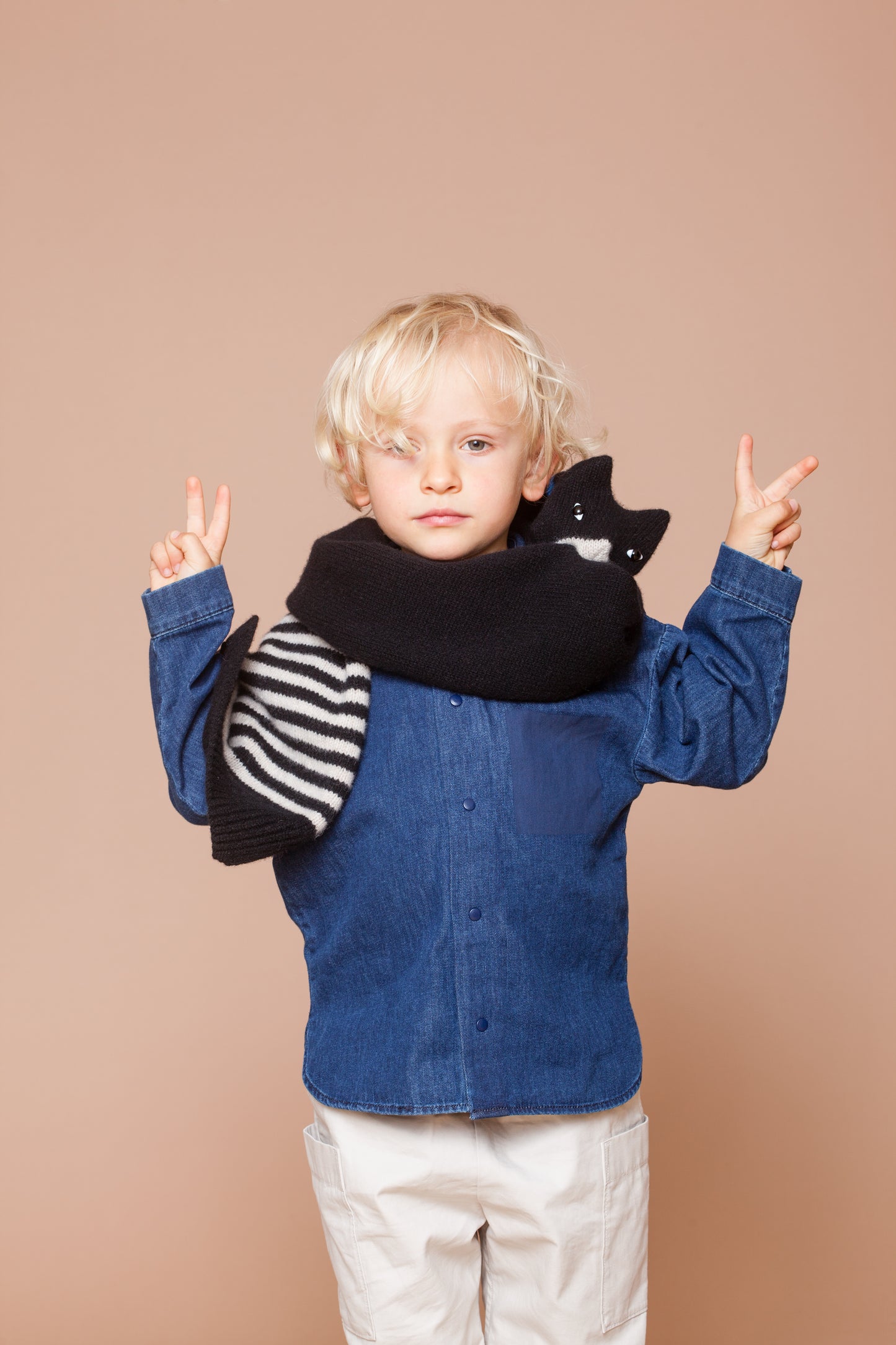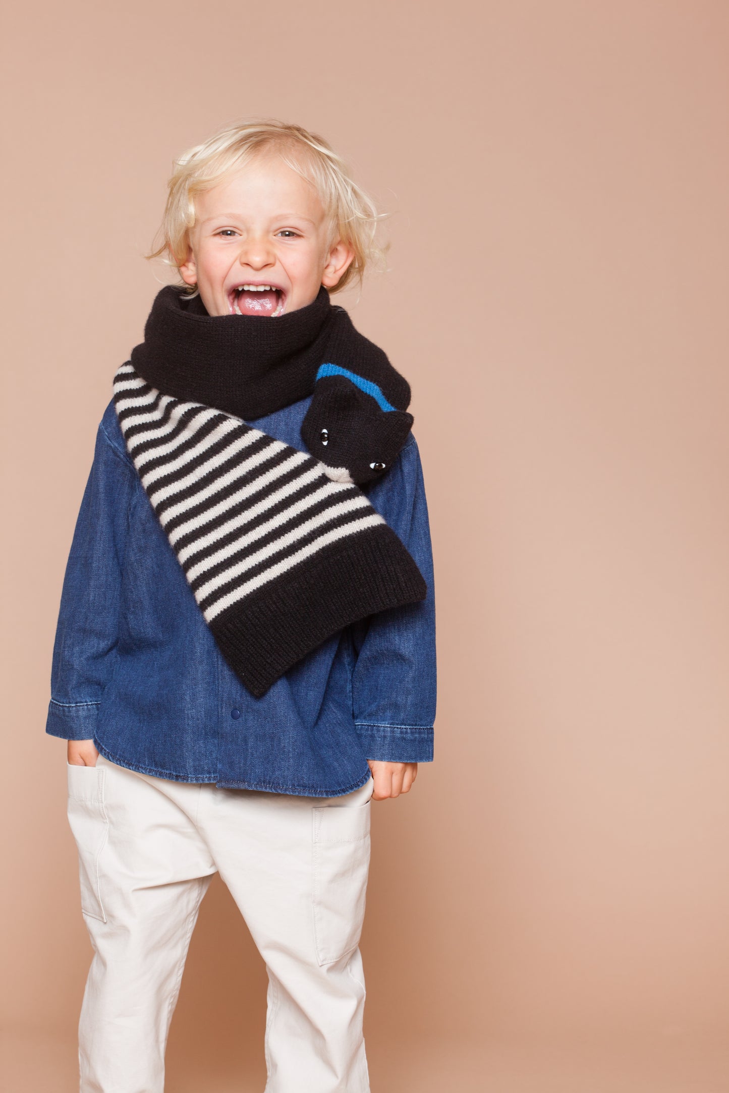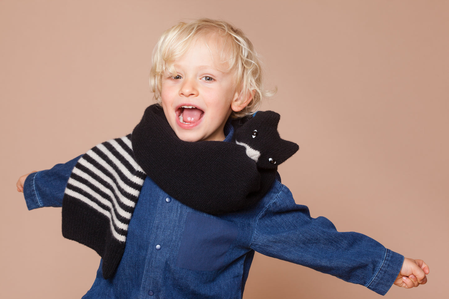 Lio trägt den Katzenschal für Kinder. Geeignet für 4 - 14 jährige Jungen und Mädchen. Auch die Kleinen können ihn leicht selber an- und ausziehen. Im Maul der Katze befindet sich eine Klammer aus Kunststoff.
