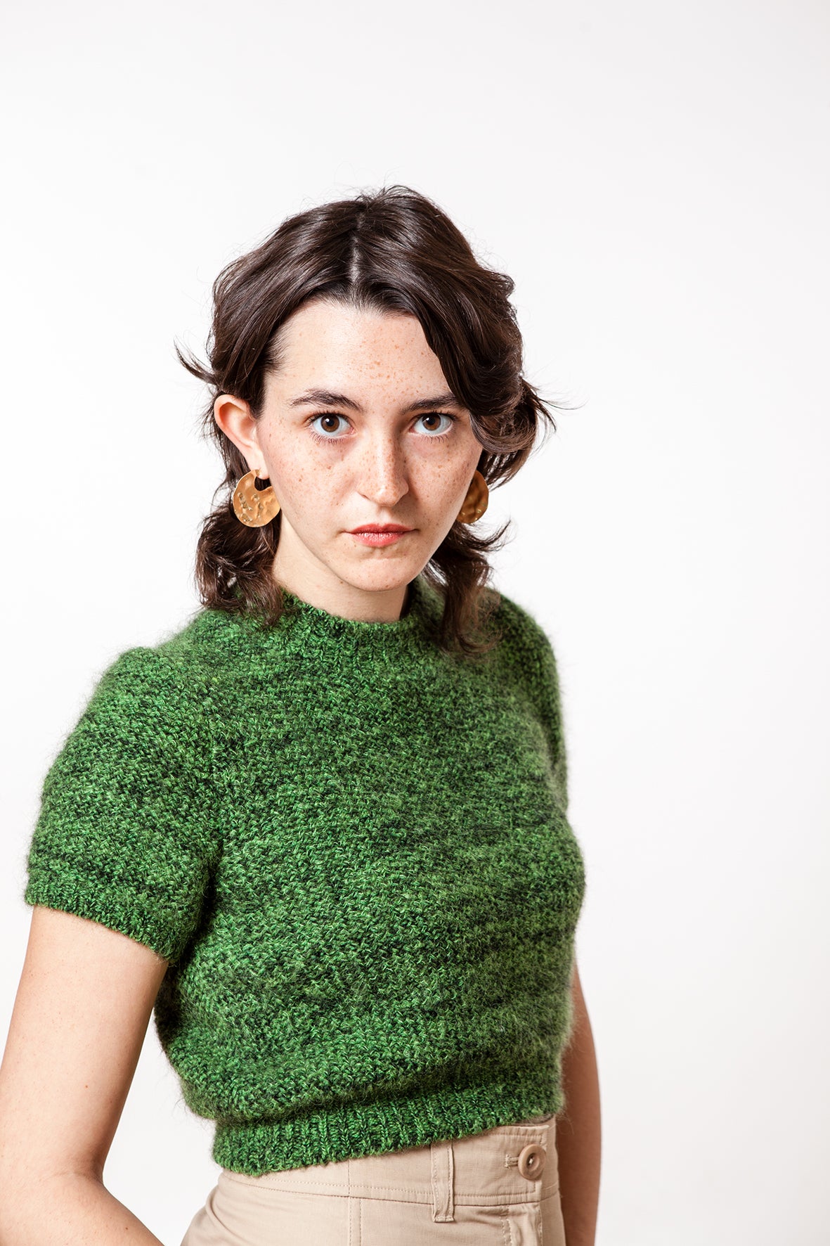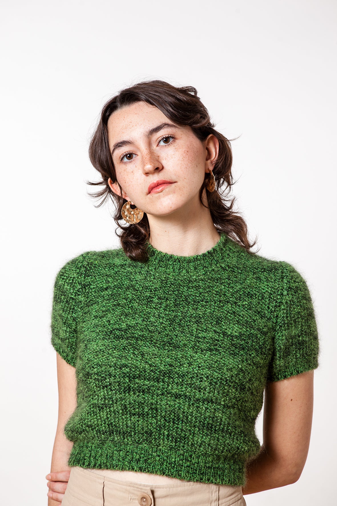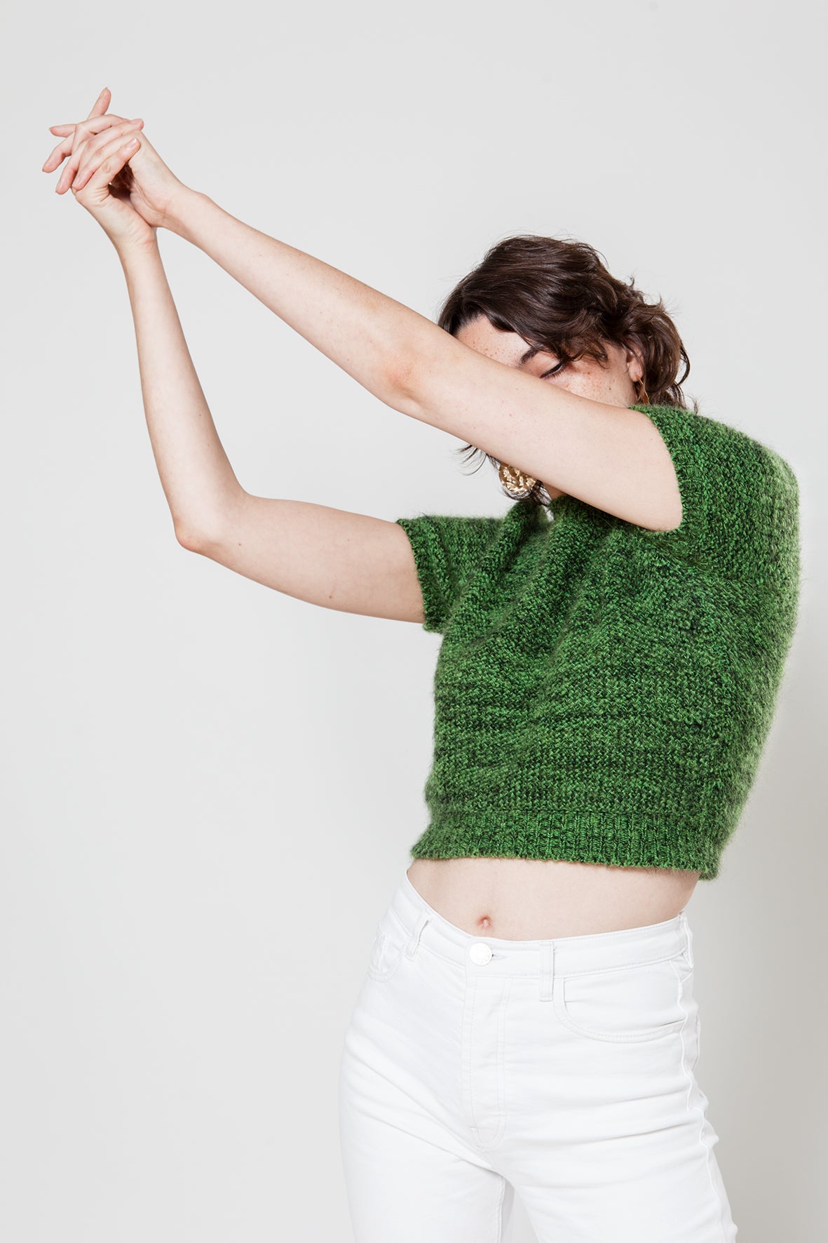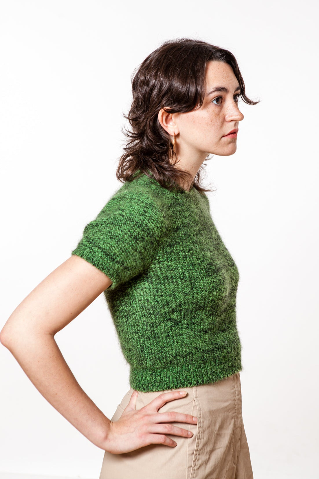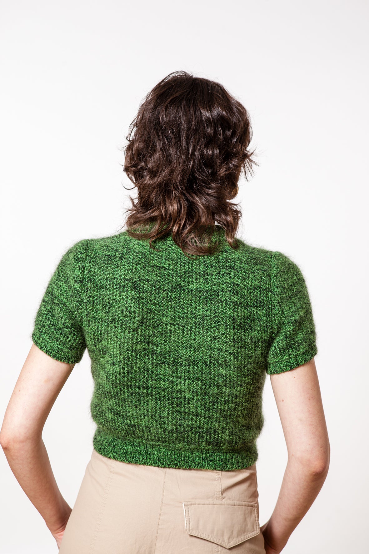 Deze casual trui met korte mouwen is gebreid op een handbreimachine in een prachtig patroon. Je kunt hem heel goed dragen in de lente en de zomer. De halslijn is vrij wijd.